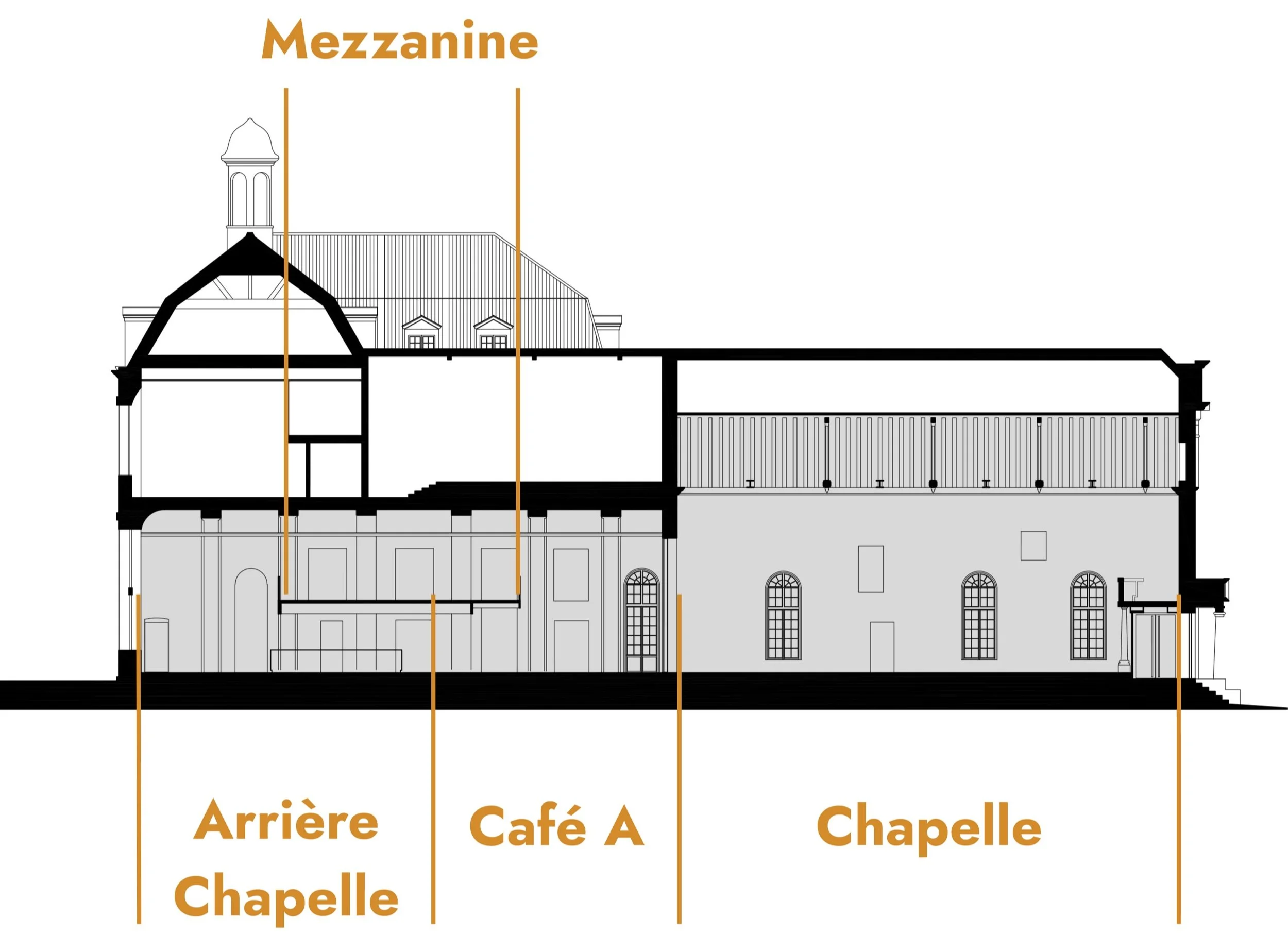 Elle permet de doubler la capacité de la chapelle et, si vous le souhaitez, d’ouvrir votre événement sur les espaces du Café A.